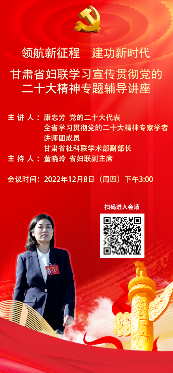 2022年12月8日,省妇联邀请党的二十大代表、甘肃省社科联学术部副部长、全省三八红旗手、全省脱贫攻坚贡献奖先进个人康忠芳开展“领航新征程 建功新时代--学习宣传贯彻党的二十大精神”线上专题辅导讲座,白银市妇联组织全市各级妇联干部收看了此次专题辅导讲座。