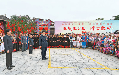 4月25日至27日,中共中央总书记、国家主席、中央军委主席习近平在广西考察。这是27日上午,习近平在南宁市广西民族博物馆外,同参加三月三“歌圩节”民族文化活动的各族群众亲切交流。 |