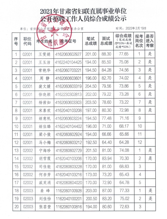 2021年甘肃省妇联直属事业单位公开招聘工作人员综合成绩公示