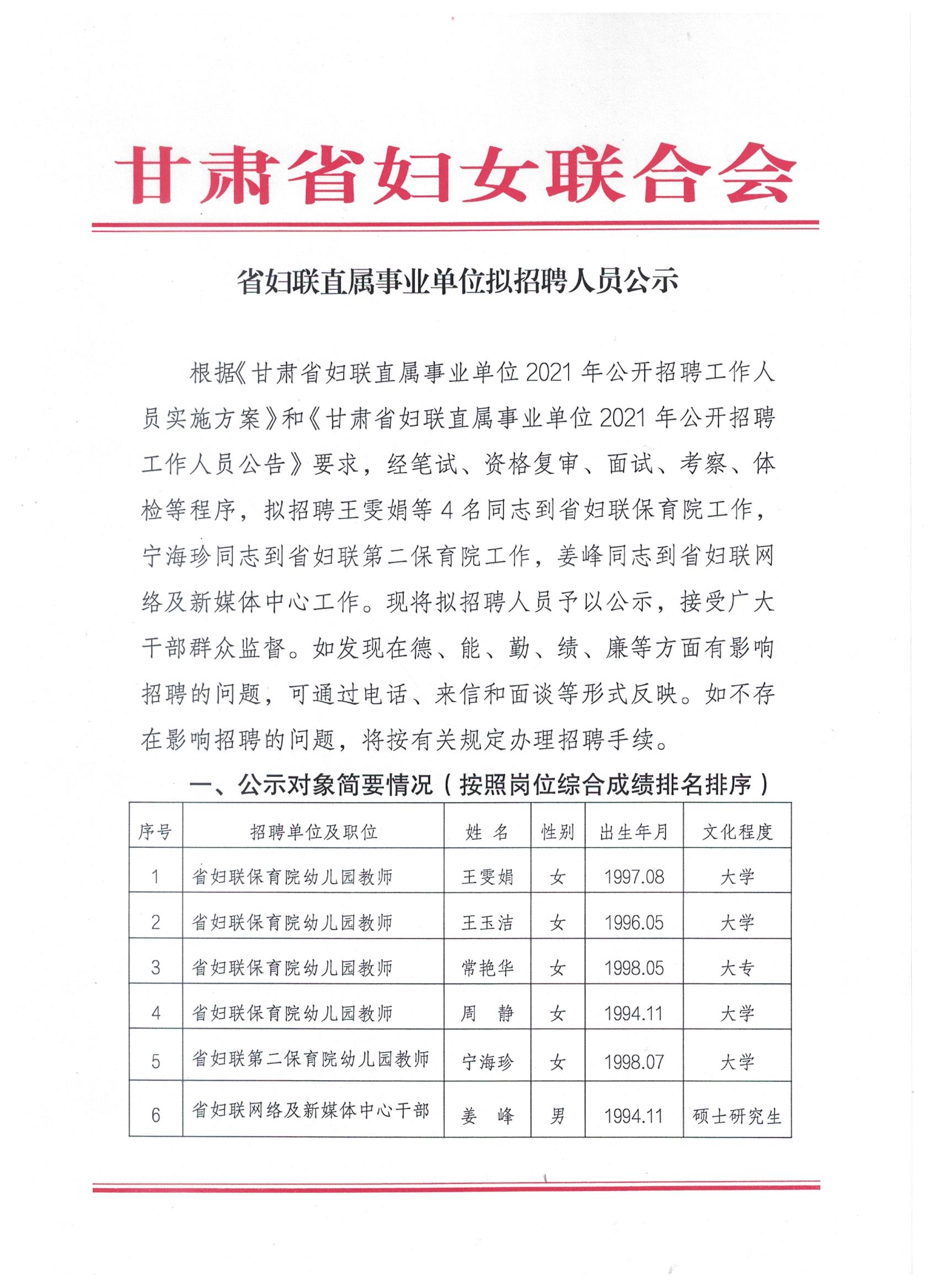 省妇联直属事业单位拟招聘人员公示