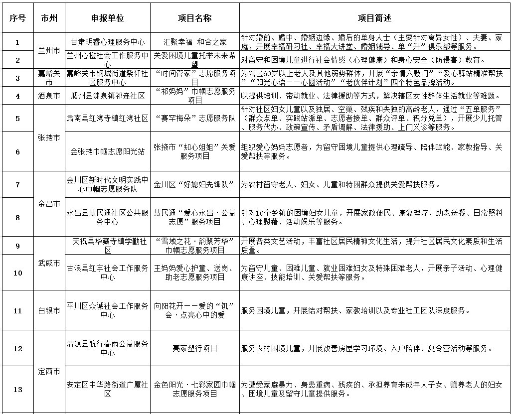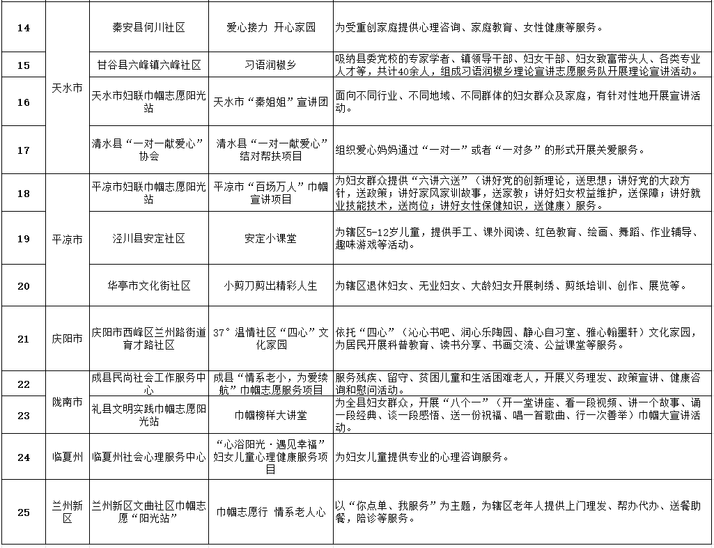甘肃省丝路花开·巾帼志愿服务特色项目(25个)