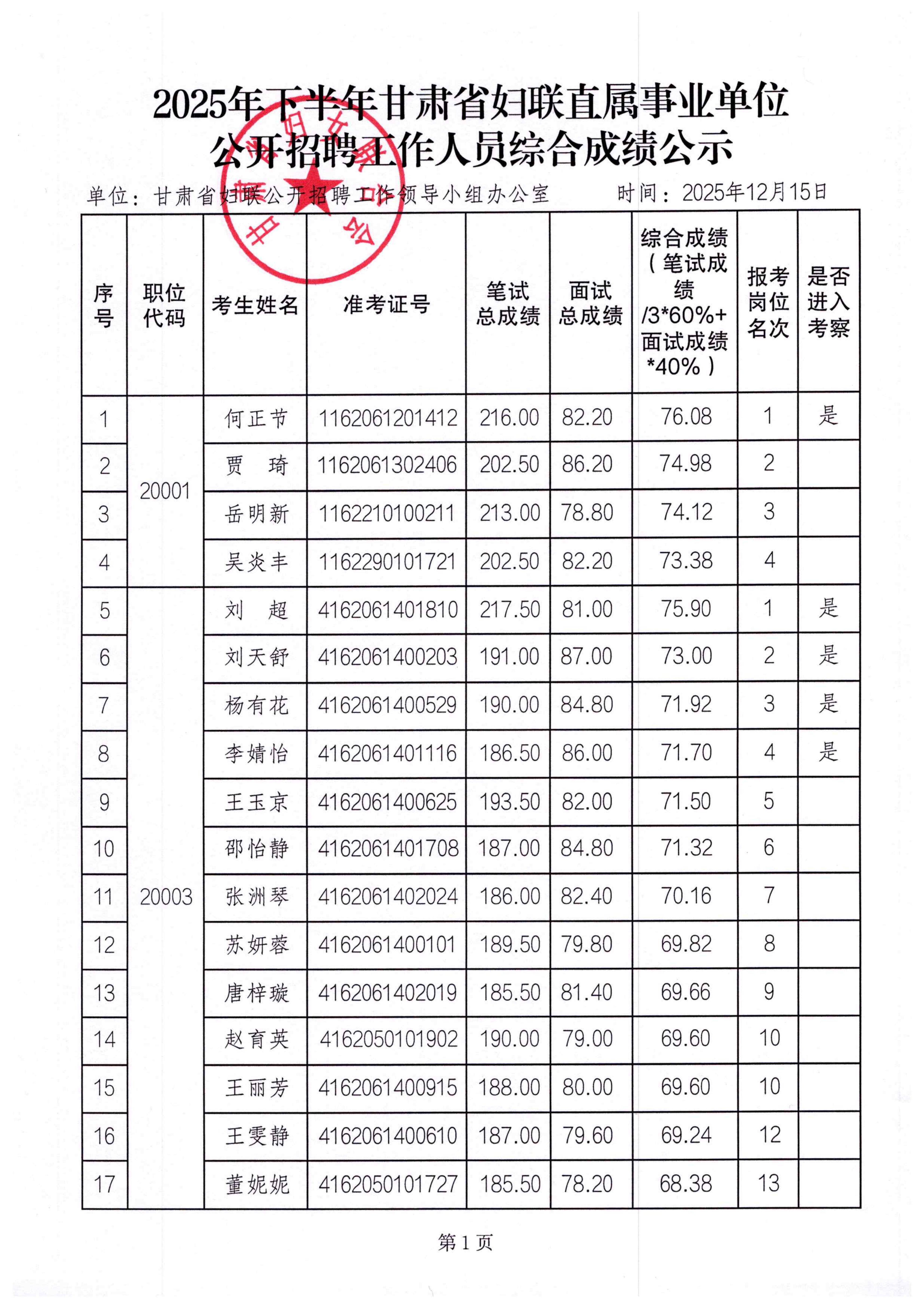 2025年下半年甘肃省妇联直属事业单位公开招聘工作人员综合成绩公示