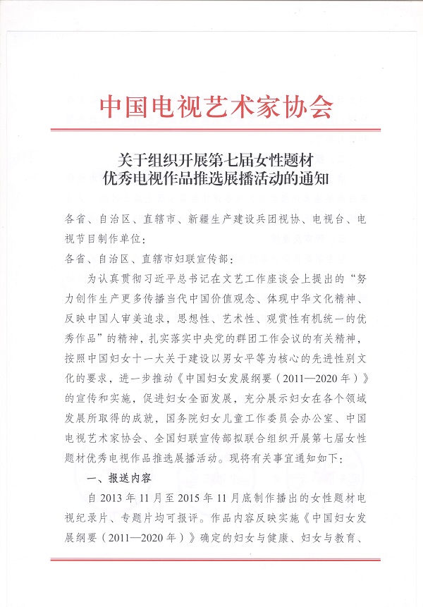 为认真贯彻习近平总书记在文艺工作座谈会上提出的“努力创作生产更多传播当代中国价值理念、体现中华文化精神、反映中国人审美追求,思想性、艺术性、观赏性有机统一的优秀作品”精神,扎实落实中央党的群团工作会议有关精神,近日,国务院妇女儿童工作委员会办公室、中国电视艺术家协会、全国妇联宣传部联合组织开展了第七届女性题材优秀电视作品推选展播活动。现将《关于组织开展第七届女性题材优秀电视作品推选展播活动的通知》转发给你们,请按通知要求认真组织申报。 附件:《关于开展第七届女性题材优秀电视作品推选展播活动的通知》 甘肃省妇联2015年11月4日