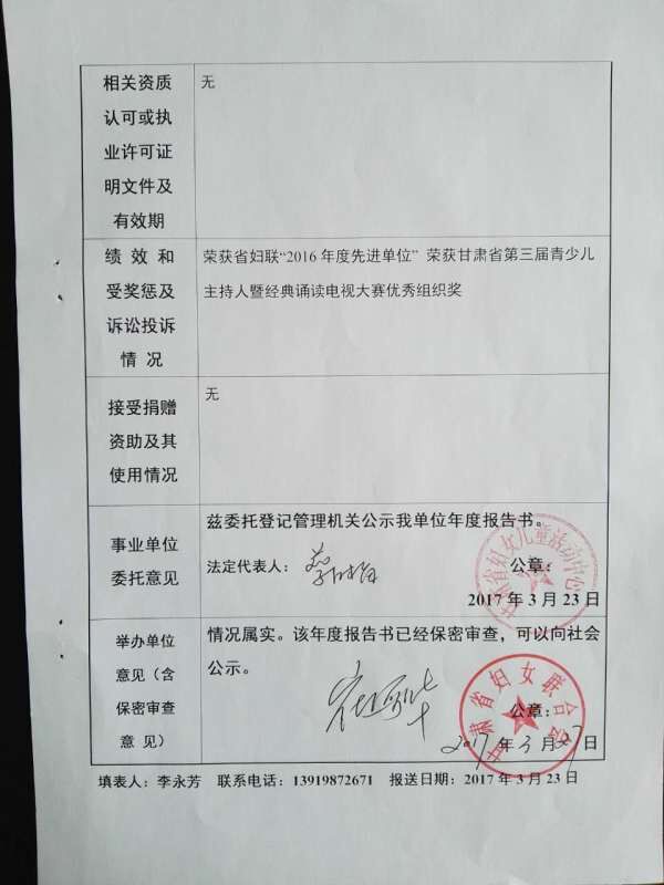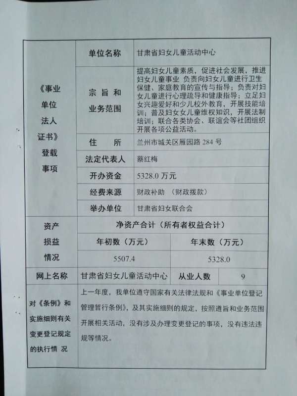 甘肃省妇女儿童活动中心2016年度事业单位法人年度报告书
