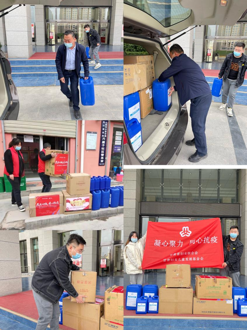 4月1日,甘肃省妇联、基金会携手兰州翊领江杉服饰有限公司向兰州市七里河区建兰路街道王家堡社区、兰石社区捐赠价值0.5万元的方便面108箱、矿泉水40件,关爱温暖身处防疫一线的“逆行者”,为他们加油鼓劲。