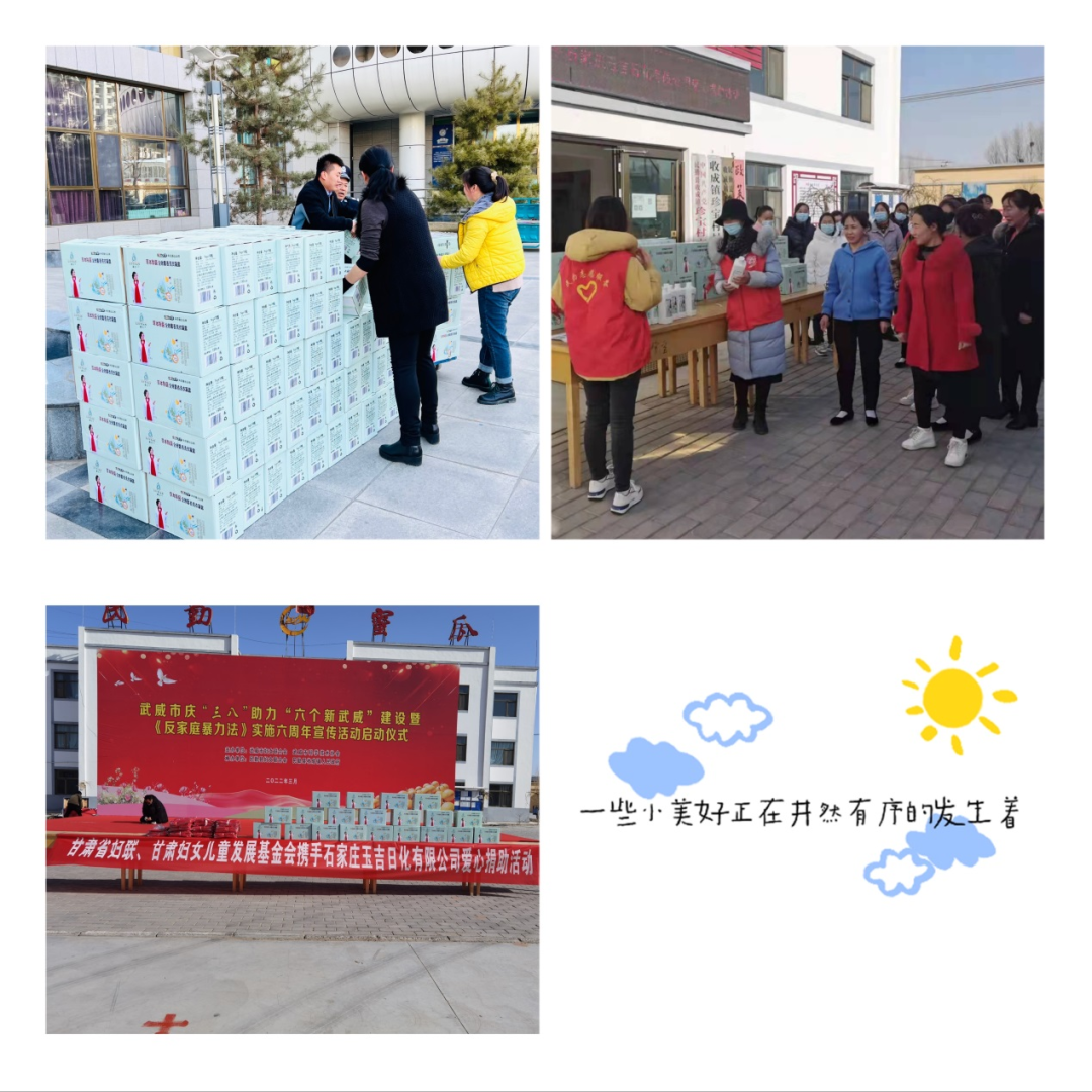 深圳前海维怡美生物科技有限公司在妇女节当天,为一线妇女工作者送去了700套价值13.86万元的“瞬恋”护花三宝抑菌套盒,这不仅仅是一份礼物,更重要的是提高了女性的健康意识和自我保健能力,唤起社会各界对一线妇女工作者的关心关爱,为她们的健康保驾护航;同时,中国儿童少年基金会为武威市4000名小学生捐赠2万双棉袜子。