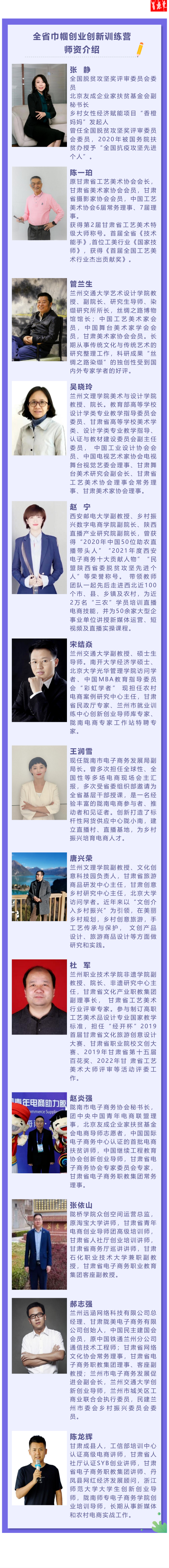 本次训练营为期一周,课程设置主要有非遗手工传承与创新、文创产品设计、女性创业、电商直播带货、电商扶贫与乡村振兴、企业投资与管理等内容,邀请了省内外工艺美术大师、非遗传承人、电商导师和政府相关业务部门负责人等13名创业指导专家,通过理论教学、案例分析、分享互动、现场观摩等教学模式进行系统性授课。