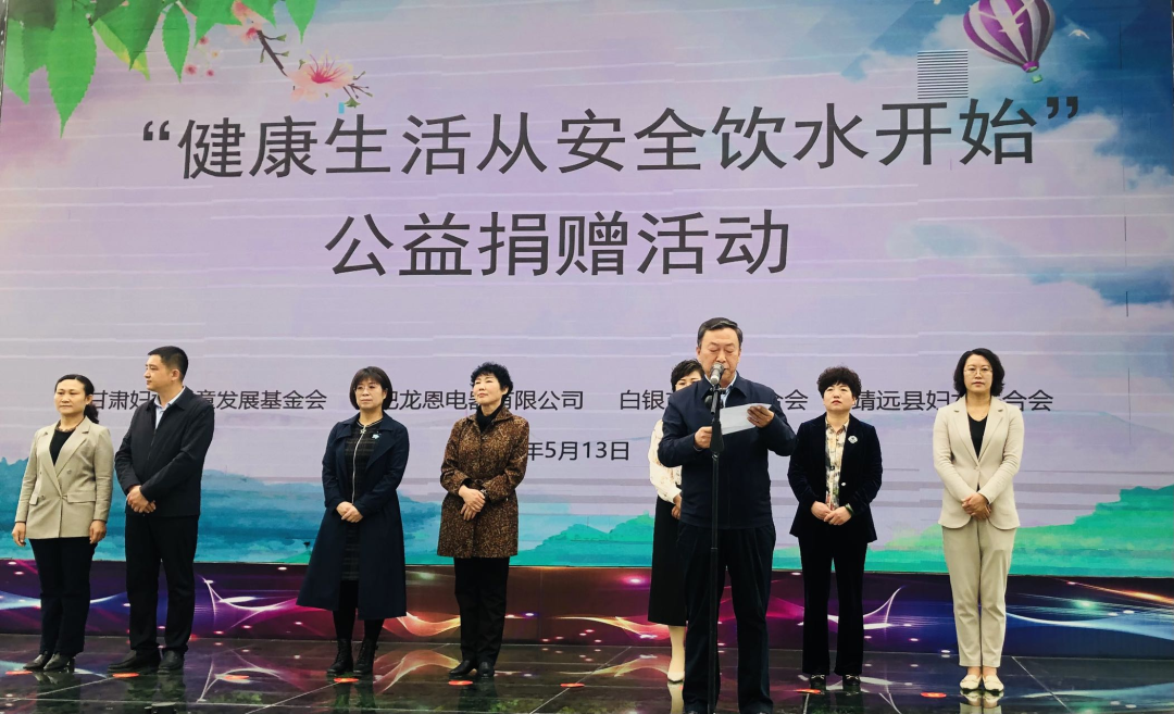 为了深入贯彻落实习近平新时代中国特色社会主义思想和党的十九大精神,助力乡村振兴,改善居民饮水条件,5月13日,甘肃妇女儿童发展基金会、白银市妇联携手合肥龙恩电器有限公司在白银市靖远县东湾镇开展“健康生活从安全饮水开始”公益捐赠活动。白银市妇联举行国际家庭日主题宣传活动。甘肃妇女儿童发展基金会理事长胡兰、省妇联二级巡视员崔海华 、省妇联一级调研员、甘肃妇女儿童发展基金会副理事长兼秘书长周华,陕西万泉环保科技工程有限公司董事长、合肥龙恩智创运营总监董美玲,白银市妇联副主席、市政府妇儿工委办主任吴军芳,靖远县委常委、宣传部长张维斌,副县长杨宏琴出席活动,活动由白银市妇联主席周育洁主持。