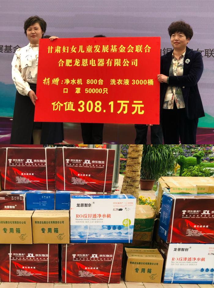 此次活动捐赠智能净水机800台、洗衣液3000桶、口罩50000只,总价值308.1万元,为白银市702个村、69个乡镇办实事送关爱。捐赠的净水机由合肥龙恩电器有限公司免费运输、安装和调试,让群众喝上健康放心的饮用水,让群众真正得到实惠。