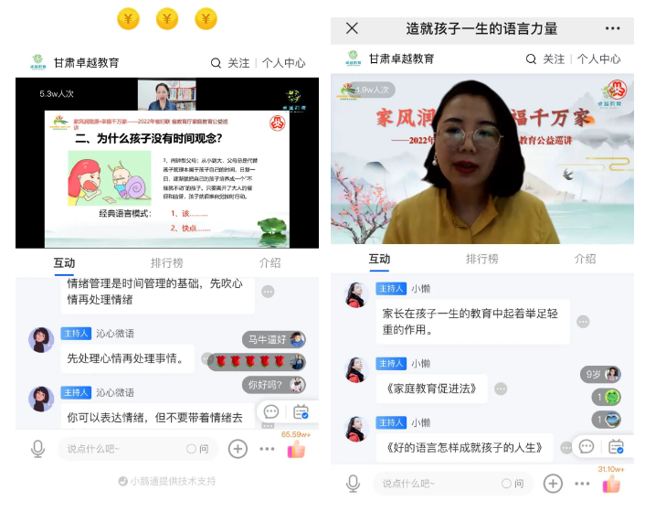 张掖市妇联妇联统筹安排,整体推进,以直播互动+在线答疑的方式,授课专家针对幼儿敏感期、小学阶段、中学阶段孩子不同成长阶段特点,进行了深入浅出的讲解,为众多家庭送去构建和谐家庭关系、帮助孩子健康成长的科学教子新路子、好办法。