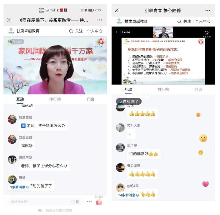本阶段的巡讲中,主要针对目前普遍存在的青春期孩子沟通难、幼儿心理变化容易被忽视、家长额外增加孩子课业负担等现象展开。《引领青春 静心陪伴》《走近青春期孩子的心》《让孩子爱上学习的密码》《会爱才是真爱——及时给孩子六大心理营养》《孩子的画会说话》等专题讲座既呈现了家庭教育中常见的冲突,又提供了改善亲子关系、建构幸福家庭的实用性策略,让家长们深刻地意识到,很多时候,自己在教育孩子方面无能为力,与孩子产生矛盾,恰恰是因为自己的知识匮乏,丧失了学习的能力。很多家长通过在线互动和后台留言的方式,表达了自己的看法。不少家长认为,正是由于自己不能全面、客观地认识孩子身心成长的规律,因此无法接纳当下出现的问题,更不能对孩子的未来发展做出预判,越守旧越焦虑,越无能为力就越是主观武断,导致了亲子关系的恶化,也造成了家庭中的沟通不畅。