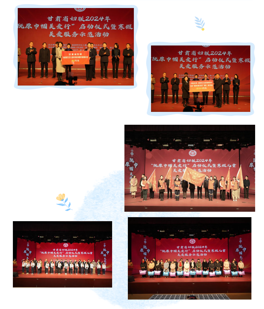 省妇联党组成员、副主席欧杰草讲话,省教育厅党组成员、副厅长党勤致辞,省民政厅二级巡视员刘爽向全省发出关爱行动倡议。活动为5支“巾帼志愿队”授旗。省妇联、甘肃妇女儿童发展基金会向各市州妇联发放978.8万元的“陇原巾帼关爱行”善款和物资及价值40万元的巾帼暖心包,用于关爱救助全省困境妇女儿童。联合省科协开展了“走进科技生活 感受创新魅力”2024寒假儿童关爱服务示范活动,体验了非遗文化皮影戏、智慧农业、消防安全科普秀,观看了无人机、机器人等科普表演,各种有趣的科普实验瞬间点燃了现场的气氛,让孩子们沉浸在科技的趣味中,感受科学的魅力。