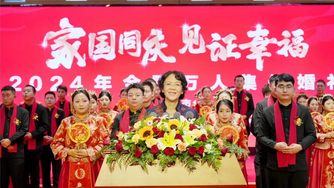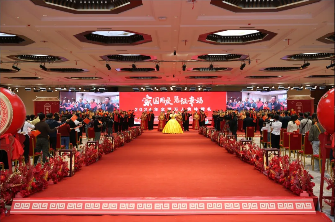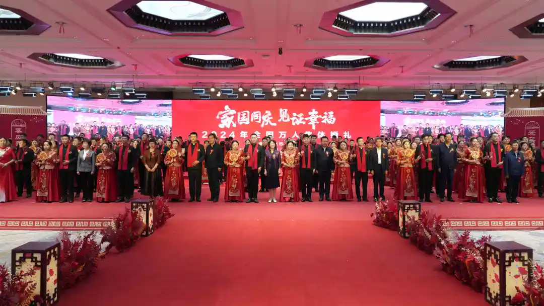 9月22日,全国妇联、国家民委、民政部、农业农村部、中央军委政治工作部22日联合举办“家国同庆 见证幸福”2024年全国万人集体婚礼。婚礼在北京主会场、各省区市和新疆生产建设兵团49个分会场同步进行,来自全国各省区市和港澳台地区的5100多对新人参与这场规模盛大的中式集体婚礼。