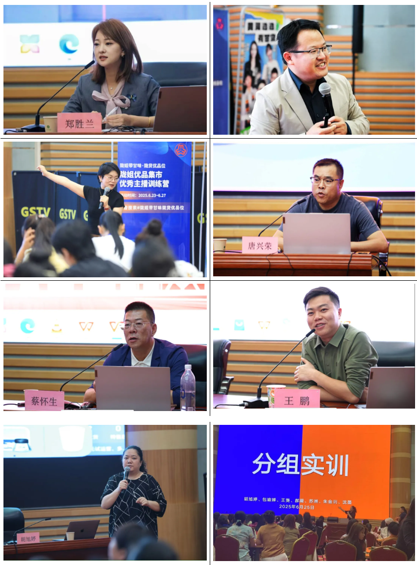 为确保培训效果,训练营采用了“专题辅导 + 案例分析 + 实训演练 + 小组 PK”四位一体的课程体系,不仅以专题辅导的形式,为学员构建系统的直播电商知识框架,而且,让学员从实践案例分析中汲取经验教训;实训演练和小组PK,根据学员的不同直播风格、销售货品特色、后台工作分工,将主播临时组成10个小组,分别以“美丽庭院—兰山小镇”、“甘肃好物健康专场”、“书记助农”、“听非遗人讲和尚头”、“小杨嫂和姐们的水果专场”、“甘肃苦荞助农专场”、“英子姐们的厨房帮手”、“听陇姐讲非遗故事”、“巾帼家政”、“美味天水”10个直播专场,为临时组队的学员们,在协作磨合、直播前期的策略规划、直播间货盘选品、多场景直播搭建以及全流程筹备管理等多重运营难点上,提供了最真实的现场教学呈现,激发了学员潜能,提升了实战能力,促进团队协作与创新。