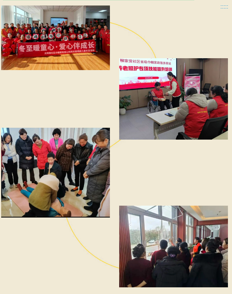 驿站里,巾帼志愿者、家政服务员与社区老人、居民围坐一起,大家揉面擀皮、调馅包饺,欢声笑语间,香气四溢的饺子承载着团圆的温馨,暖意沁入心田。饺子包好后,巾帼志愿者和“爱心妈妈”带着热气腾腾的饺子和米面粮油等生活物资,上门慰问独居老人、困难家庭和困境儿童等特殊群体。她们不仅送上暖心物资,还主动帮忙打扫屋子、检查水电安全,耐心询问生活上的需求,用贴心陪伴驱散冬日的寒冷。不少驿站还趁这个机会,给想找工作的妇女们提供家政技能培训,宣讲相关政策,帮大家学本领、在家门口就业。