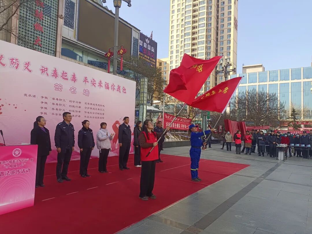 的禁毒防艾倡议声中拉开帷幕。巾帼志愿者面向现场群众宣读倡议书,以铿锵有力的话语发出“珍爱生命、远离毒品、科学防艾”的号召。随后,省妇联、省禁毒办相关领导为榆中县蓝天救援队“禁毒志愿服务队”和榆中县城关镇朝阳路社区“妈妈禁毒队”授旗,标志着基层禁毒志愿服务队伍又添新力量,为构建社会化禁毒网络注入了巾帼动能。在代表发言环节,“妈妈禁毒队”代表在发言中表达了筑牢禁毒防艾战线的坚定决心,质朴而坚定的话语道出了全体巾帼志愿者的心声。发言结束后,参与活动的领导、志愿者及群众纷纷走向禁毒防艾承诺签名墙,郑重签下自己的名字,以实际行动践行禁毒防艾的坚定庄严承诺,签名现场气氛热烈,一笔一划都承载着大家对美好生活的向往与追求。金崖镇“禁毒妈妈志愿服务队”带来的太平鼓表演将现场气氛推向高潮,既展现了黄土高原的民俗风情,更以群众喜闻乐见的形式传递着禁毒防艾的决心。