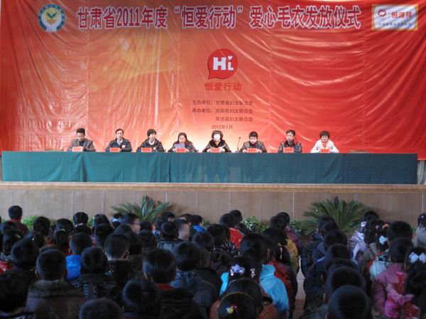 2011年是中国共产党建党90周年,也是我省连续开展“恒爱行动”的第四个年头。我省2011年度“恒爱行动”的主题是“恒爱行动温暖革命老区”,内容是将酒泉各界编织的爱心毛衣统一发放到庆阳革命老区。活动于2011年10月21日在酒泉正式启动,发放恒源祥爱心毛线1000斤,截止目前,共回收毛衣6800件。在庆阳集中发放1000件,主要对象为华池县列宁小学贫困儿童和留守儿童。