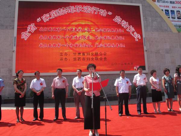 为进一步加大禁毒宣传教育工作力度,推动“毒品知识进万家活动”和“家庭禁毒承诺行动”深入进行,提高广大妇女及家庭识毒、拒毒、防毒的意识和能力,6月19日,省妇联在定西市安定区举行了全省“家庭禁毒承诺行动”启动仪式。省妇联党组成员、纪检组长胡兰,省公安厅禁毒总队政委张民山,定西市委、市政府相关领导,市直相关部门干部、妇女干部、家庭代表、社区工作人员近3000多人参加了活动。