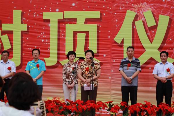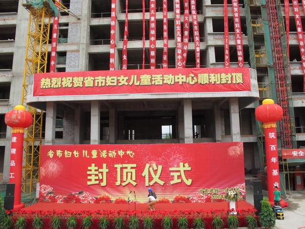省妇联党组成员、副主席朱玉兰宣布大楼封顶,并代表省市妇联发表了热情洋溢的讲话,她说,省市妇女儿童活动中心2011年9月16日正式开工建设以来,在参建各方精诚团结、密切合作和积极沟通下,中心大楼在“安全第一、质量优先、注重速度”的前提下,一步一个脚印,一天一个变化,主体结构在大家的期待中顺利封顶。