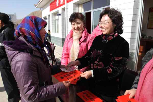 1月30日,省妇联党组书记、主席韩克茵,党组成员、副主席管春梅,副巡视员、机关党委书记丁文建及相关部门同志,前往安定区鲁家沟镇山林村,现场为贫困群众发放香港爱心人士何崇本先生捐助的春节慰问金。经村委会征求全体村民的意见,此次捐款将重点用于发展生产,改善生产生活条件。在发放仪式上,山林村176户家庭的代表集中在村委会院内,按照每户1000元标准,喜气洋洋、井然有序地领取了17.6万元慰问金。