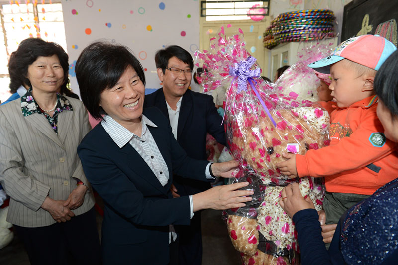 沈跃跃一行首先来到漳县三岔镇中心小学看望那里的留守儿童。一进教室,她便蹲下身亲切地拉起小朋友的手,详细询问他们的学习和生活情况,并为他们送上了“消除婴幼儿贫血行动”爱心营养包、学习用品、和玩具,在六一儿童节即将到来之际,沈跃跃祝愿小朋友们节日快乐,天天快乐。