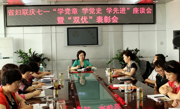 在纪念中国共产党成立92周年之际,省妇联召开 “学党章、学党史、学先进”座谈会暨“双优”表彰会,表彰先进,交流“学党章、学党史、学先进”学习心得。机关和下属事业单位全体党员干部职工参加了会议。