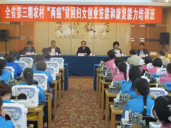 这期培训班共有50名“两癌”贫困妇女参加,她们主要来自酒泉、张掖、白银、武威、金昌等市州。其中,汉族49人,藏族1人;年龄最小的25岁,最大的48岁,平均年龄40.2岁;11人患宫颈癌,39人患乳腺癌。培训班分两个阶段进行,学员在兰州进行为期一周的缝纫技术和丝网花培训之后,将赴北京接受北京中医药大学专家义诊。