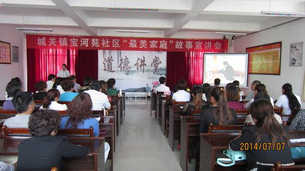 金昌市把“寻找”活动与社区道德讲堂、孝道红黑榜、“永昌好人”等活动有机结合在一起,开展了道德讲堂“最美家庭”专场活动。宝林里社区以“妇女之家”为阵地,组织辖区居民开展“身边人讲自家事·寻找最美家庭”道德讲堂;宝河苑社区道德讲堂暨“最美家庭”故事宣传会以唱歌曲、学模范、谈感悟、诵经典、颁发奖、送祝福为主要内容,吸引群众了解最美家庭、向最美家庭学习。
