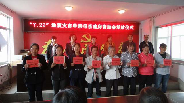 9月11日,甘肃妇女儿童发展基金会在岷县茶埠镇举行了“心系岷县灾区,情牵单亲母亲”建房资助金发放仪式,现场为30名在岷县“7.22”地震灾害中受灾的单亲特困母亲发放救助金。