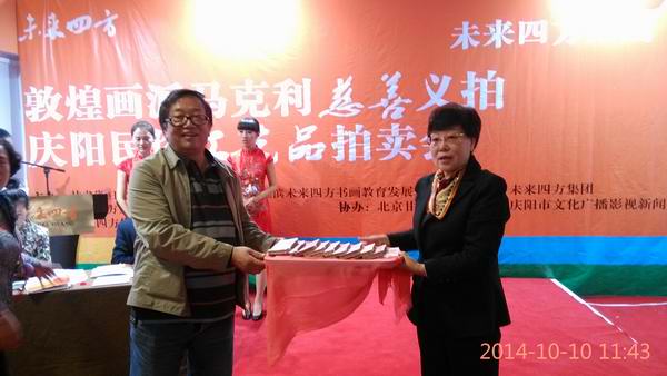 拍卖会上,甘肃日报社总编辑、甘肃省书法家协会理事马克利的46幅油画风景写生作品、10余幅书法作品和庆阳市文化广播影视新闻出版局组织的庆阳民俗作品参加拍卖。拍卖结束后,分别将拍卖款项中的10万元和1785元现场捐赠给了甘肃妇女儿童发展基金会,用以资助我省贫困儿童。 康娅红代表甘肃妇女儿童发展基金会接受了捐款,并向捐赠者表示衷心感谢。她指出,慈善事业是一项为国分忧、为民解难、利国利民的崇高而光彩的事业,发展慈善事业,是弘扬中华民族的传统美德、建设社会主义精神文明的重要内容。她表示,甘肃妇女儿童发展基金会一定会将这笔善款用到最需要的地方,让这份沉甸甸的爱心结出丰硕的果实。 长期以来,四方拍卖集团发展不忘慈善,把支持慈善事业、救助弱势群体作为企业践行社会责任和升华品质的务实追求,通过慈善义拍向甘肃妇女儿童发展基金会累计捐赠义拍善款61万余元,为帮助我省贫困妇女儿童事业发展做出了积极贡献。