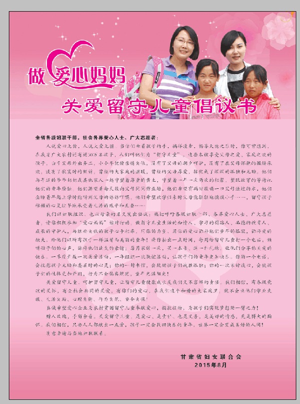 近日,甘肃省妇联向全省各级妇联干部,社会各界爱心人士、广大志愿者发出做爱心妈妈关爱留守儿童倡议,旨在引导动员更多的爱心组织和爱心人士参与到“爱心妈妈”结对关爱留守儿童的行动中来,让更多的留守儿童感受到社会的温暖。