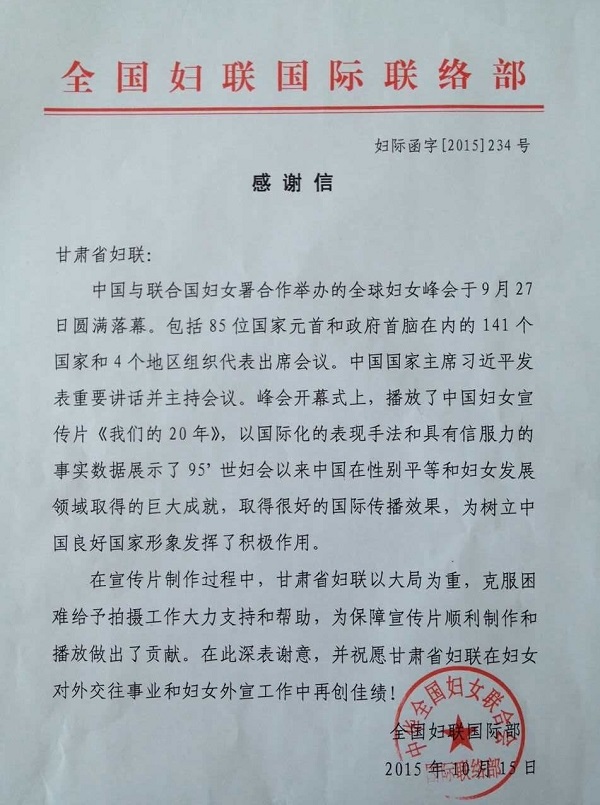 近日,全国妇联国际联络部向甘肃省妇联发来感谢信,感谢甘肃省妇联在制作全球妇女峰会宣传片《我们的20年》中给予的大力支持和帮助,并对甘肃省妇联对外交往事业和对外宣传工给予美好祝愿。