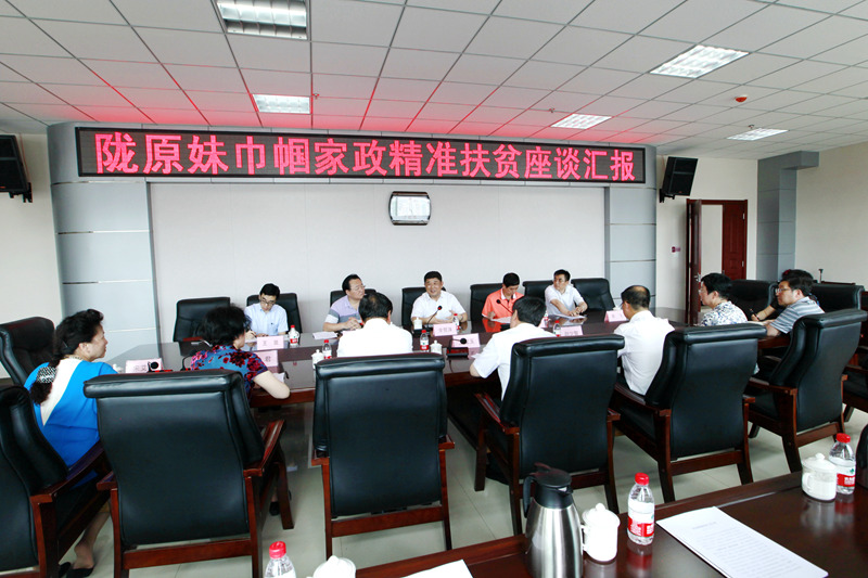 随后,召开了陇原妹巾帼家政精准扶贫座谈会,座谈会由省政府副省长郝远主持。省妇联党组书记、主席苏君,省工商联副主席、省女企业家联合会会长、兰州兰雅实业集团董事长、甘肃陇原妹巾帼家政服务有限公司董事长宋艾芳分别做了工作汇报。