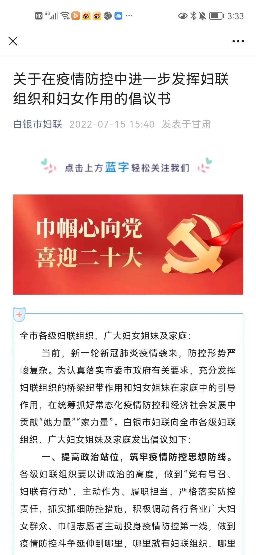 面对突如其来的疫情形势,白银市妇联第一时间召开疫情防控专题会议,迅速传达市委、市政府疫情防控工作的部署要求,利用妇联微信公众号等新媒体矩阵和县、乡、村妇联干部微信群,发布《关于在疫情防控中进一步发挥妇联组织和妇女作用的倡议书》,动员广大妇联干部、妇女群众以及巾帼志愿者凝心聚力抗击疫情。