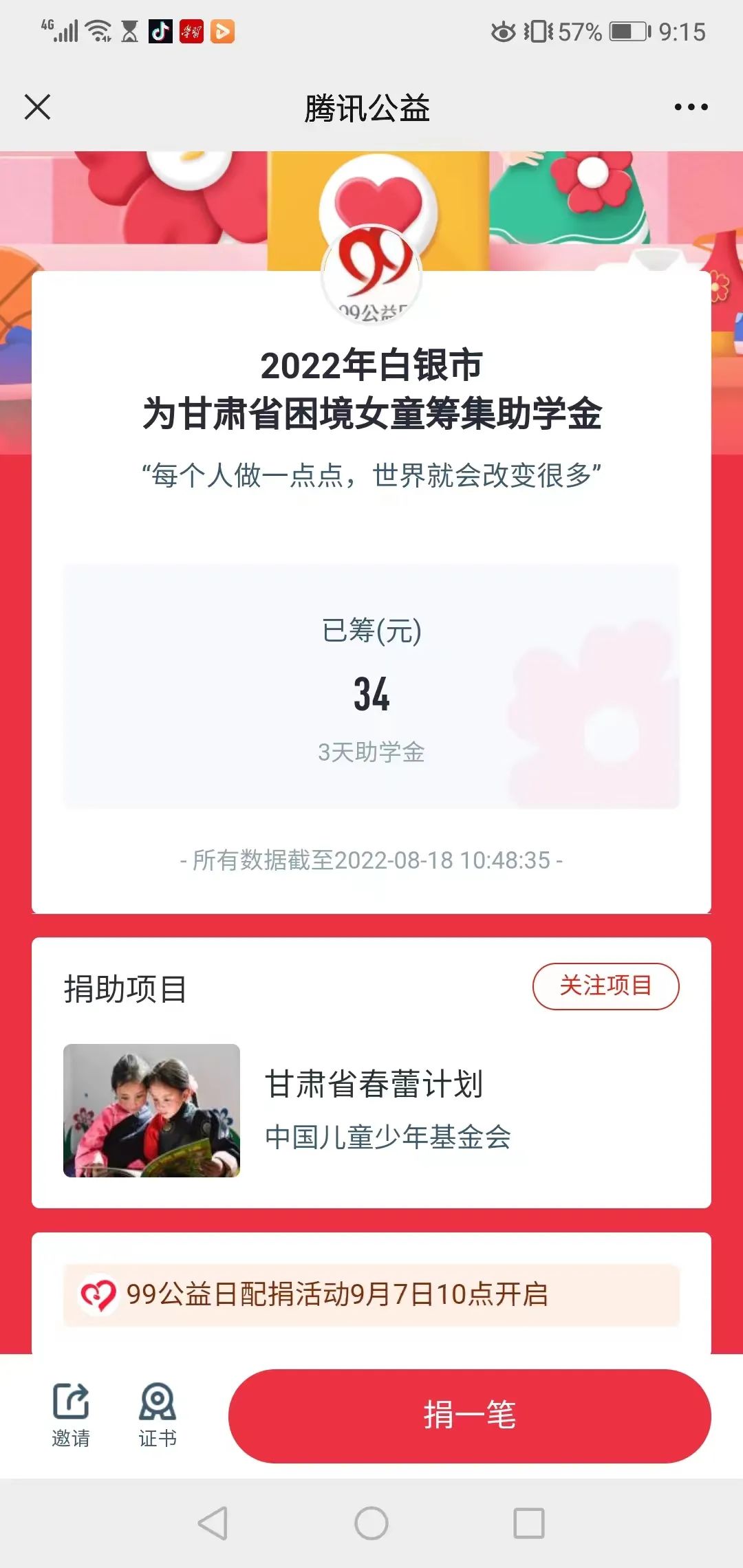 所有捐款人凡在9月7、8、9三天指定时间段参与以上两项目捐款的,均有机会获得腾讯的配捐,爱心人士也可在活动时间外,随时给项目捐款,但不能享受到腾讯的配捐资金 。