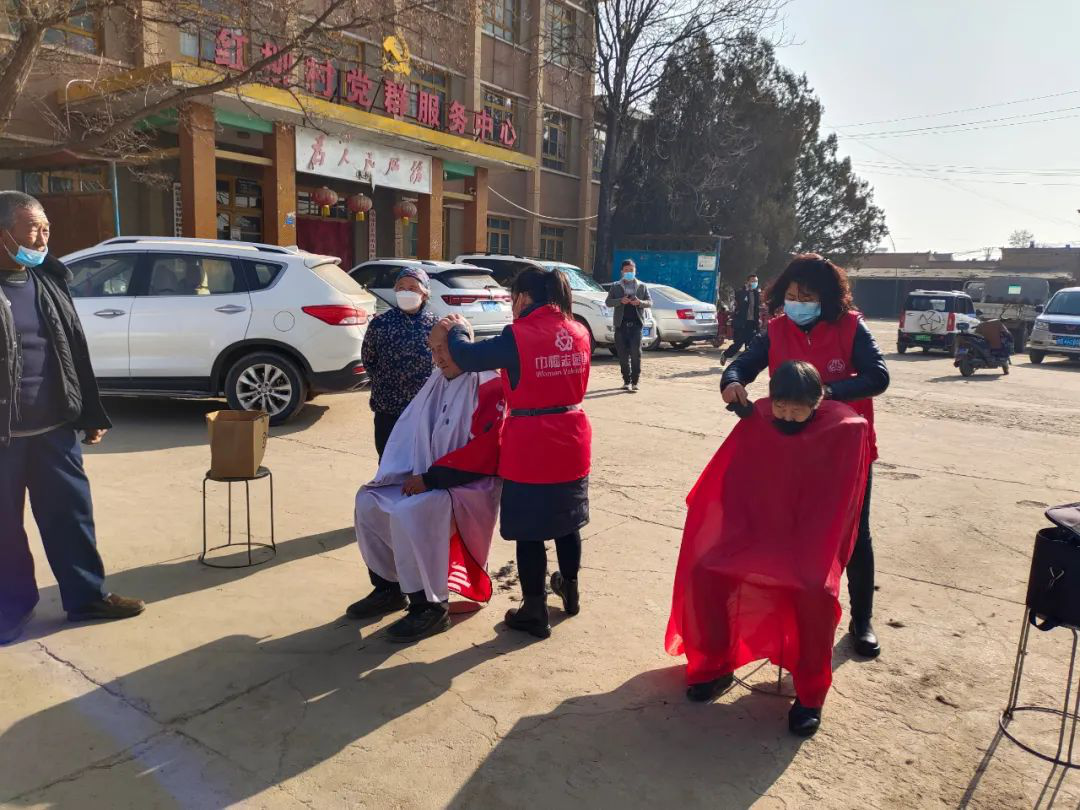 剪窗花活动中,巾帼志愿者陪同孩子剪窗花,让孩子们在了解剪窗花的过程中,感悟中华传统文化之美,感受迎春的欢乐与喜悦。爱心理发现场,志愿者们热情的为老人们理发,娴熟的动作、贴心的服务、温暖的问候,让“理发室”充满了温暖,洋溢着幸福,并为老人发放了医用口罩、春联,与老人们拉家常,宣传党的二十大精神,推动党的二十大精神深入基层、贴近群众、走进家庭。