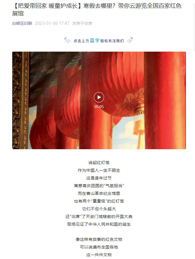 “少年儿童心向党,用心用情伴成长。”白银区妇联开展线上亲子云参观活动,大家通过人民网“红色云展厅”参观全国百家红色展馆,听党的故事、革命的故事、根据地的故事、英雄和烈士的故事,让爱党爱国爱社会主义的种子在儿童心中生根发芽、开花结果。
