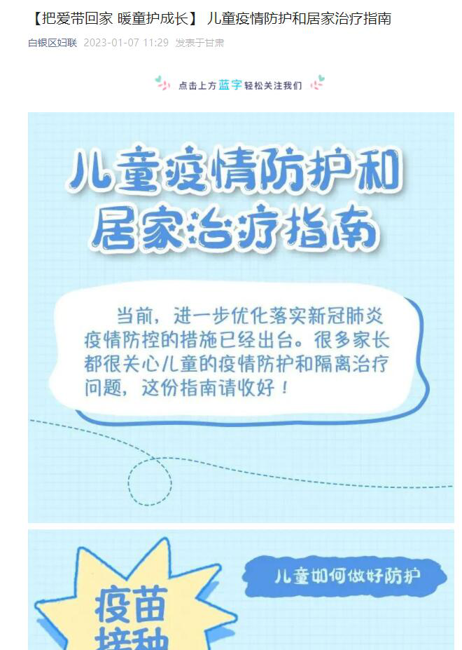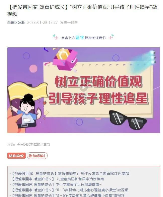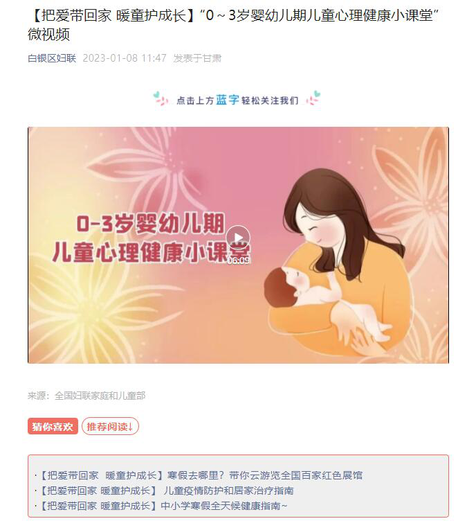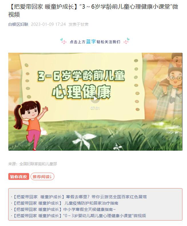 “快乐平安过寒假,守护相伴助成长。”白银区妇联灵活运用新媒体平台,发布涵盖儿童防疫知识、健康指南、心理健康微课堂等各类型文章视频,以生动有趣的形式和内容,为家长们提供家庭教育指导服务,为孩子的健康成长保驾护航。