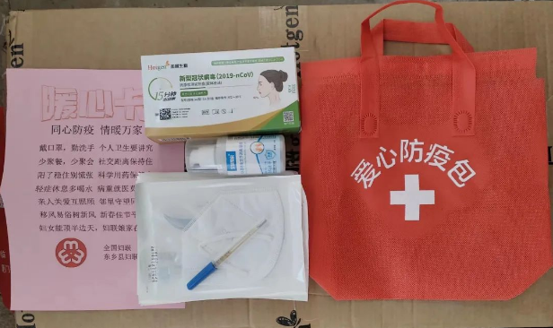 “防疫健康包”是由全国妇联中国妇女发展基金会、唯品会公益提供。每个健康包内装有温度计、酒精免洗手消毒凝胶、N95口罩、新型冠状病毒抗原检测试剂、暖心卡等防疫健康物品。