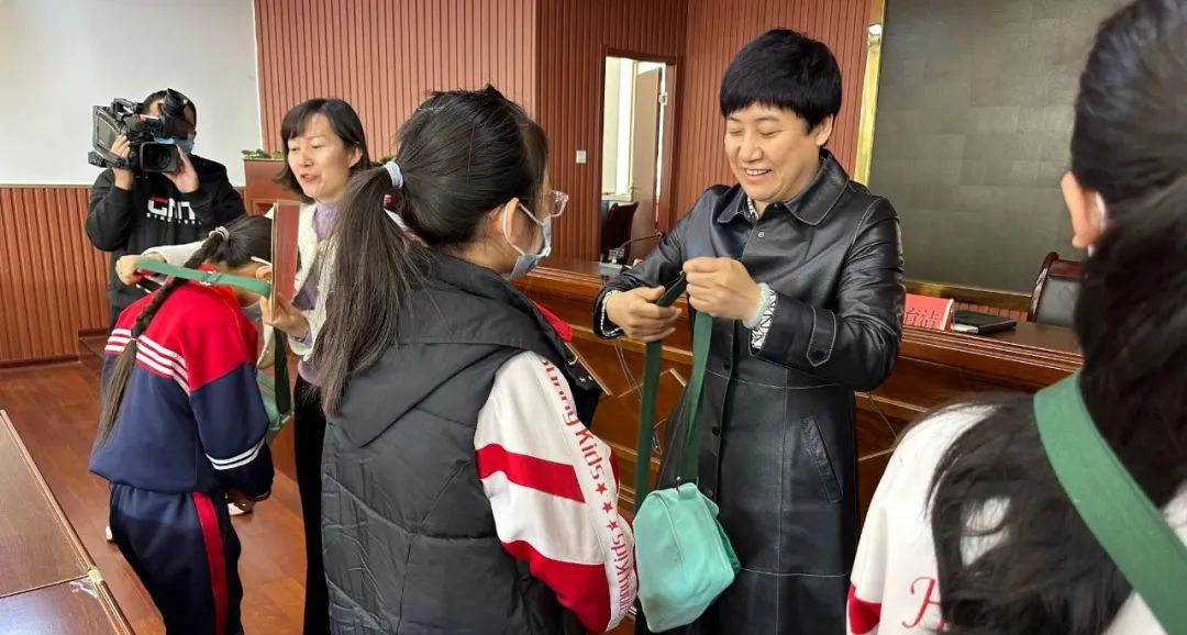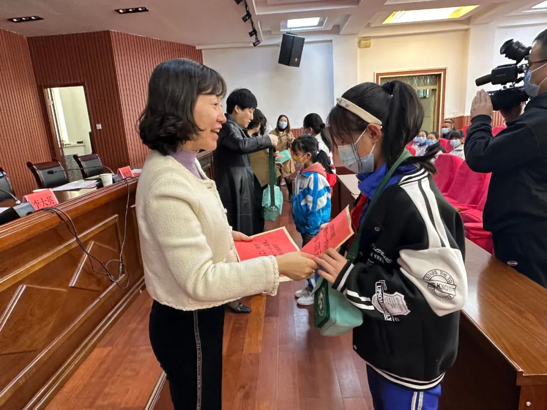 活动中,与会领导与“春蕾女童”亲切交谈,并为“春蕾女童”代表发放助学金和书包、图书、文具、防疫礼包等物资,小小的礼物饱含着满满的爱。