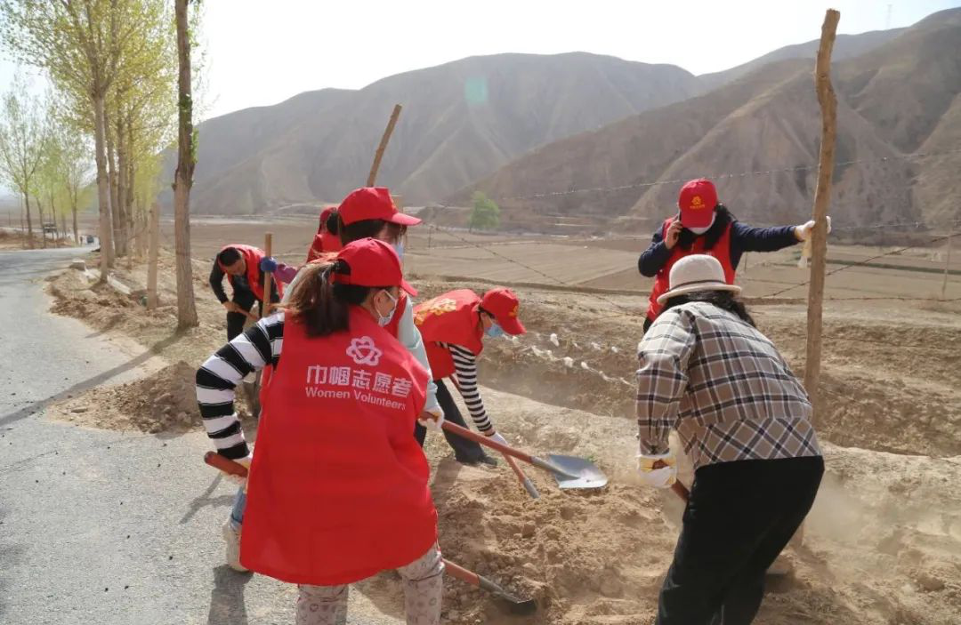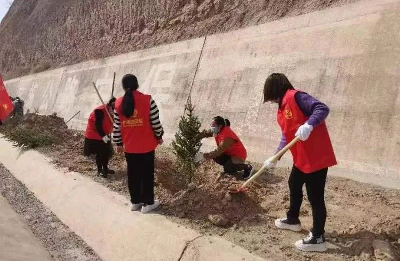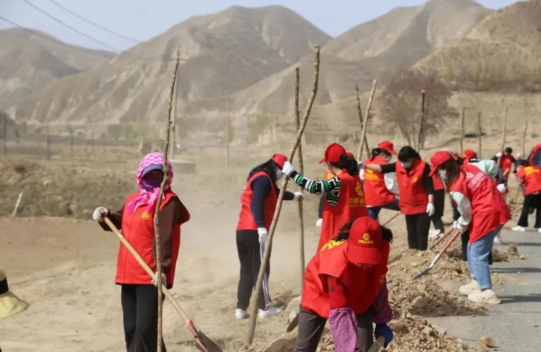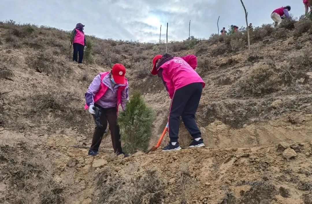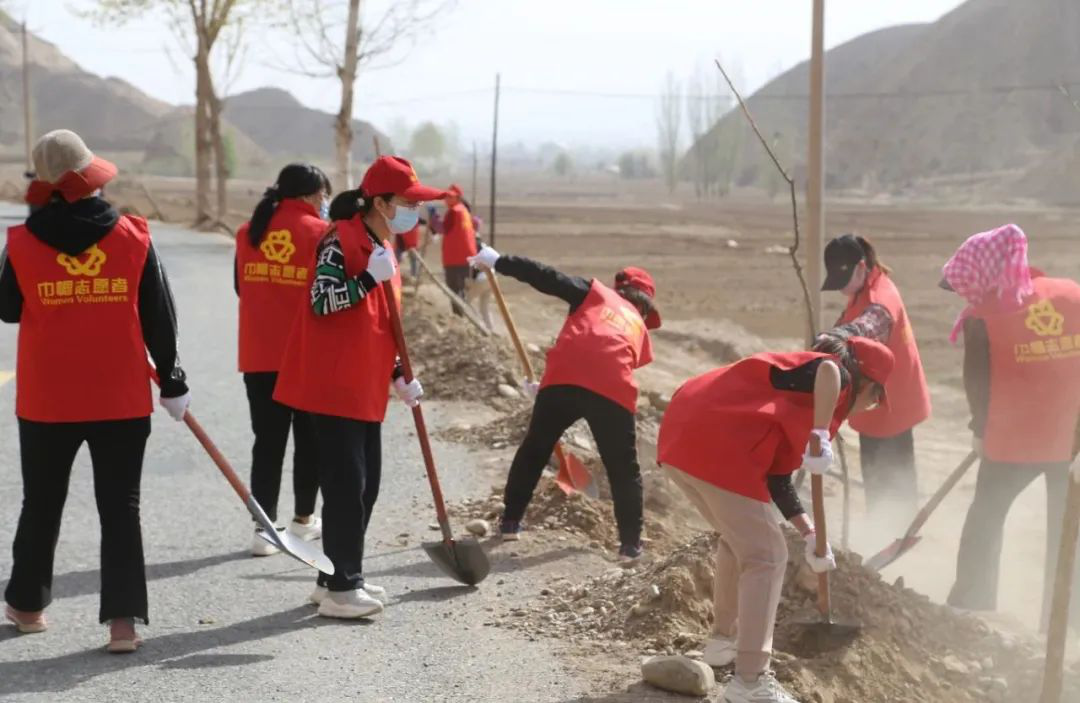 景泰县妇联组织巾帼志愿者开展春季植树活动。活动开始后,志愿者们鼓足干劲、不停不歇地栽种准备好的树苗,大家彼此配合,现场气氛热烈。
