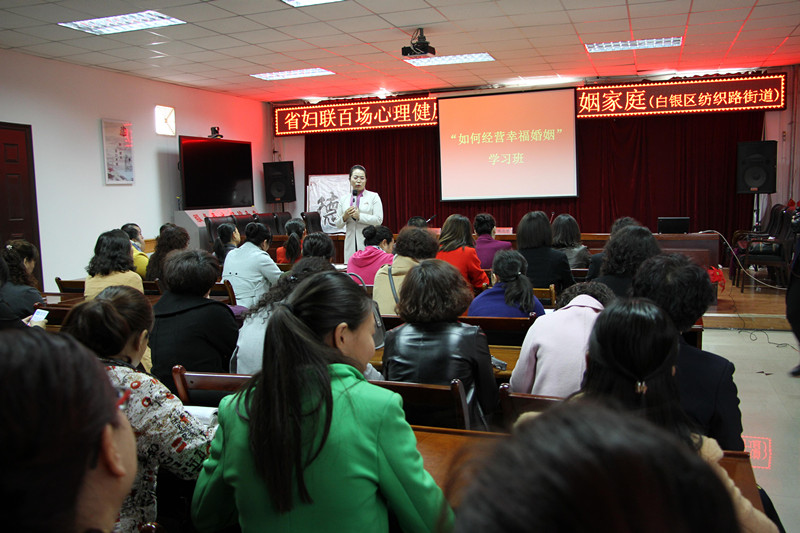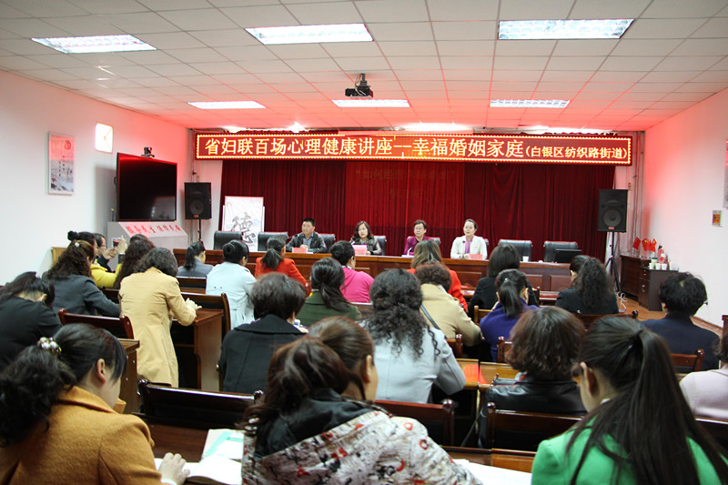 为了进一步践行社会主义核心价值观,引导广大妇女树立正确的爱情观、婚恋观,促进家庭观念的健康成长,在全社会形成奋发向上的精神力量和团结和睦的精神纽带,3月30日,省妇联百场心理健康讲座-幸福婚姻家庭走进白银区纺织路街道。活动由纺织路街道党委副书记李武学主持,市妇联副主席王月萍、区妇联主席高永琴、街道女干部及部分妇女代表90多人参加了讲座。