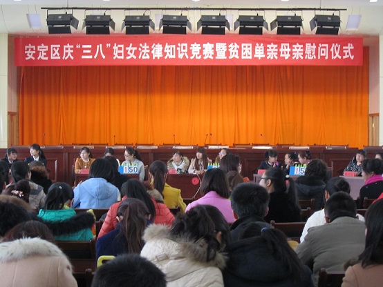 为深入学习贯彻党的十八届四中全会精神,不断提高广大妇女群众和妇联干部的法律意识,增强妇女依法维权的能力,促进家庭平安、社会和谐,3月6日,定西市安定区妇联联合区司法局、区总工会在区统办大楼九楼会议室举办了定西市安定区庆“三八”妇女法律知识竞赛暨贫困单亲母亲慰问活动。