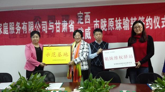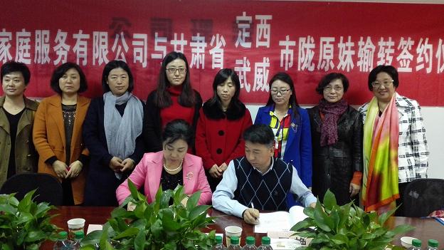 定西市妇联本着相互支持、优势互补的原则,与上海互家联家庭服务有限公司签署了关于合作建立“陇原妹”劳务输出示范基地的框架协议,协议要求在互利互惠、合作共赢的基础上由定西市妇联为其推荐输转合格的“陇原妹”品牌家政服务员。互家联家庭服务有限公司负责家政服务员的接收、管理与权益维护工作。同时举行了定西市妇联“陇原妹”劳务输出示范基地、“陇原妹”劳务输出姐妹维权驿站授牌仪式。