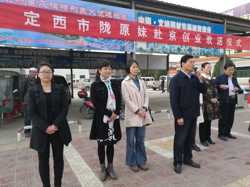 下午5时,市妇联在陇西火车站广场举行了定西市陇原妹赴京创业欢送仪式。市委副书记郑红伟、市妇联主席孙筠、全国妇联挂职干部翟雁燕等领导出席了仪式。郑红伟在讲话时鼓励她们到北京以后好好学习家政技能,希望她们通过培训充实自己,实现创业就业。丰富自己的人生,体现自己的价值。并俯下身子亲自为她们的行李箱上贴上“陇原妹”标签,希望他们发扬定西人民群众勤劳朴实、吃苦肯干的优良品格,“学习一门技术、挣上一笔钱、养活一家人、带动一批人、闯出一条路子”。
