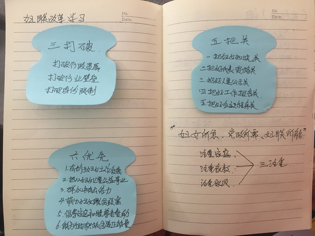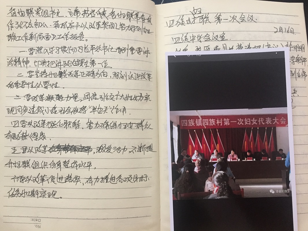 刚刚当选为四族镇四族村妇联主席的王粉连说起自己的工作来时如数家珍,头头是道,她说这一切都源于自己对这份工作的热爱以及平时的学习积累。翻开王粉连的工作笔记,满满的都是温馨感,简单的绘图,花花绿绿的贴纸,给我们耳目一新的感觉,小小的细节彰显出了她认真负责的工作、生活态度。