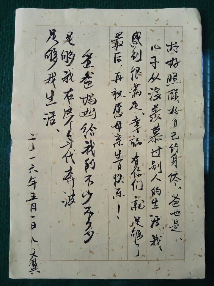 附一篇金川集团公司汽运分公司马登萍之子给母亲的一封手写行楷毛笔书信: