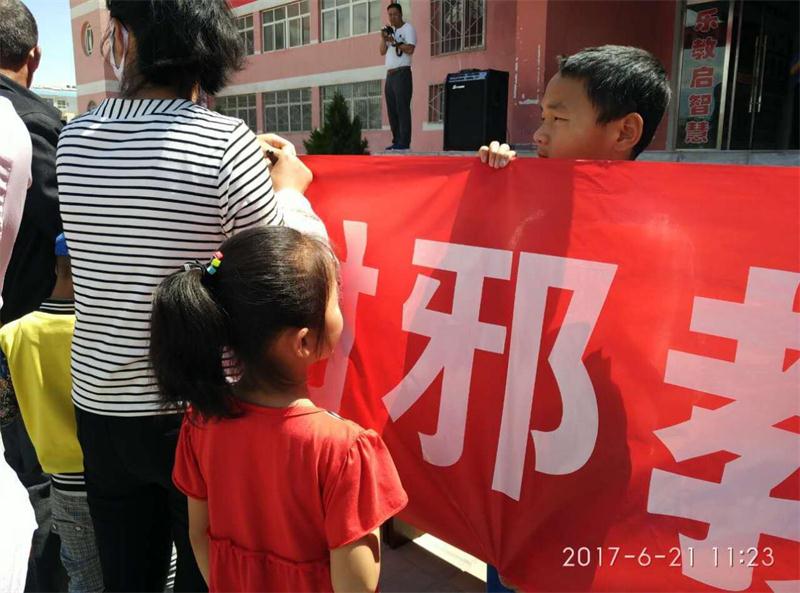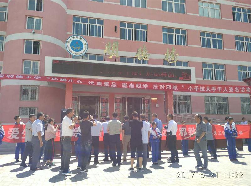 2017年6月21日,永昌县妇联联合县检察院、教育局、团县委在朱王堡明德小学开展“珍爱生命、远离毒品,崇尚科学、反对邪教”小手拉大手千人签名活动。