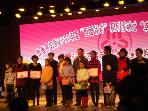 为将“恒爱行动”这项关注民生、促进社会和谐的活动深入开展,敦煌市妇联继举行“敦煌市恒爱行动启动仪式”和“敦煌市恒爱行动之情系福利院、特教中心特别关爱行动”后,近日在敦煌宾馆举行了“恒爱行动之幸福手拉手.温暖心连心”爱心毛衣表演秀暨恒爱巧手妈妈、爱心妈妈评选活动。商户代表刘艳等2名同志被评为敦煌恒爱爱心大使,张晶等12名同志被评为敦煌恒爱巧手妈妈,朱翠莲等10名同志被评为敦煌恒爱爱心妈妈,活动为2011年度敦煌市“恒爱行动“画上了圆满的句号。