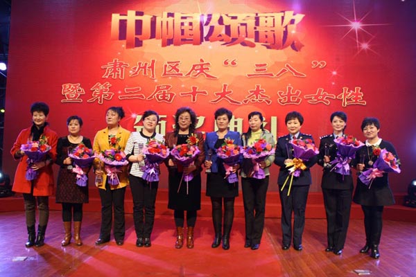 为隆重纪念“三八”国际劳动妇女节104周年,表彰和树立全区各行各业、各条战线上涌现出的妇女先进典型,激励广大妇女为“五个肃州”建功立业,3月6日晚,由肃州区委宣传部、区妇联、区广播电影电视局、区文化体育局主办的“巾帼颂歌”——肃州区庆“三八”暨“十大杰出女性”颁奖典礼隆重举行。市委常委、区委书记杨克忠,区人大常委会主任王世万,区政协主席连德礼,区委副书记张立东,市妇联副主席白淑萍等领导出席颁奖活动,全区党政机关、企事业单位干部、职工、居民群众代表共600多人参加了颁奖典礼。